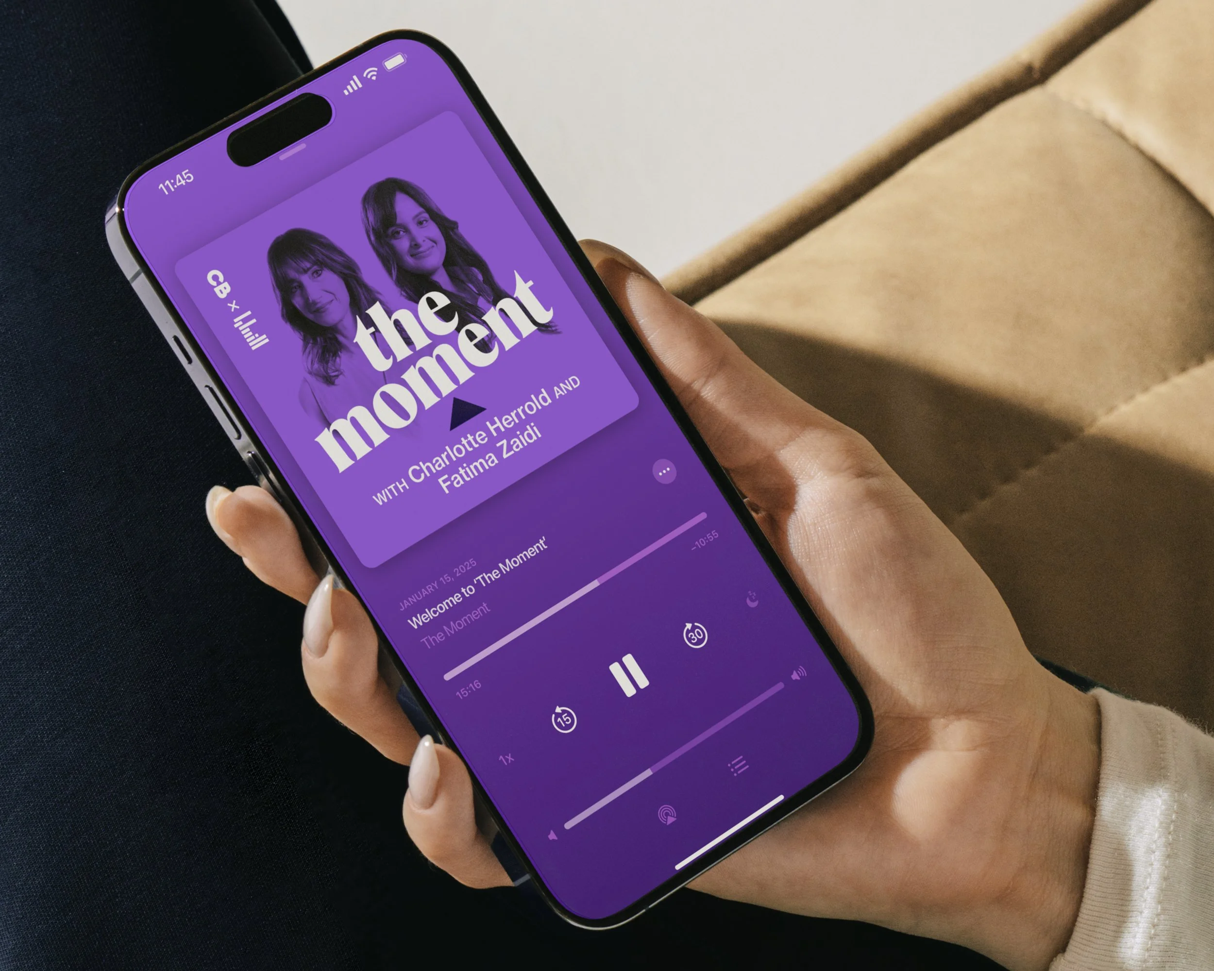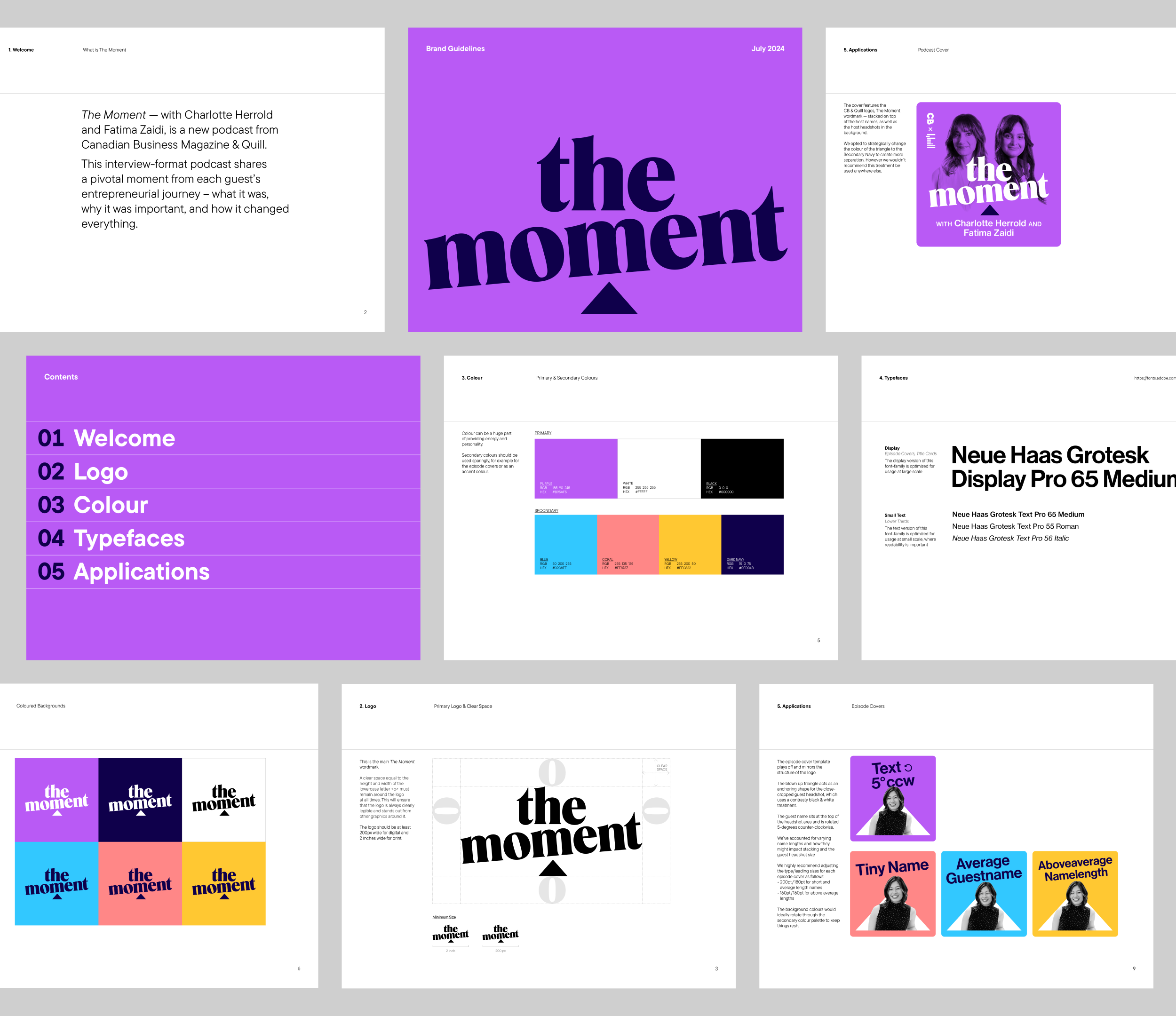For our branding of The Moment podcast, we developed a wordmark using a distinct revival font with tall proportions to ensure impact and legibility at any scale. Paired with a bright, contemporary colour palette and perched at a jaunty angle, the logo presents a young, friendly vibe to reflect the podcast’s fresh take on business news.
